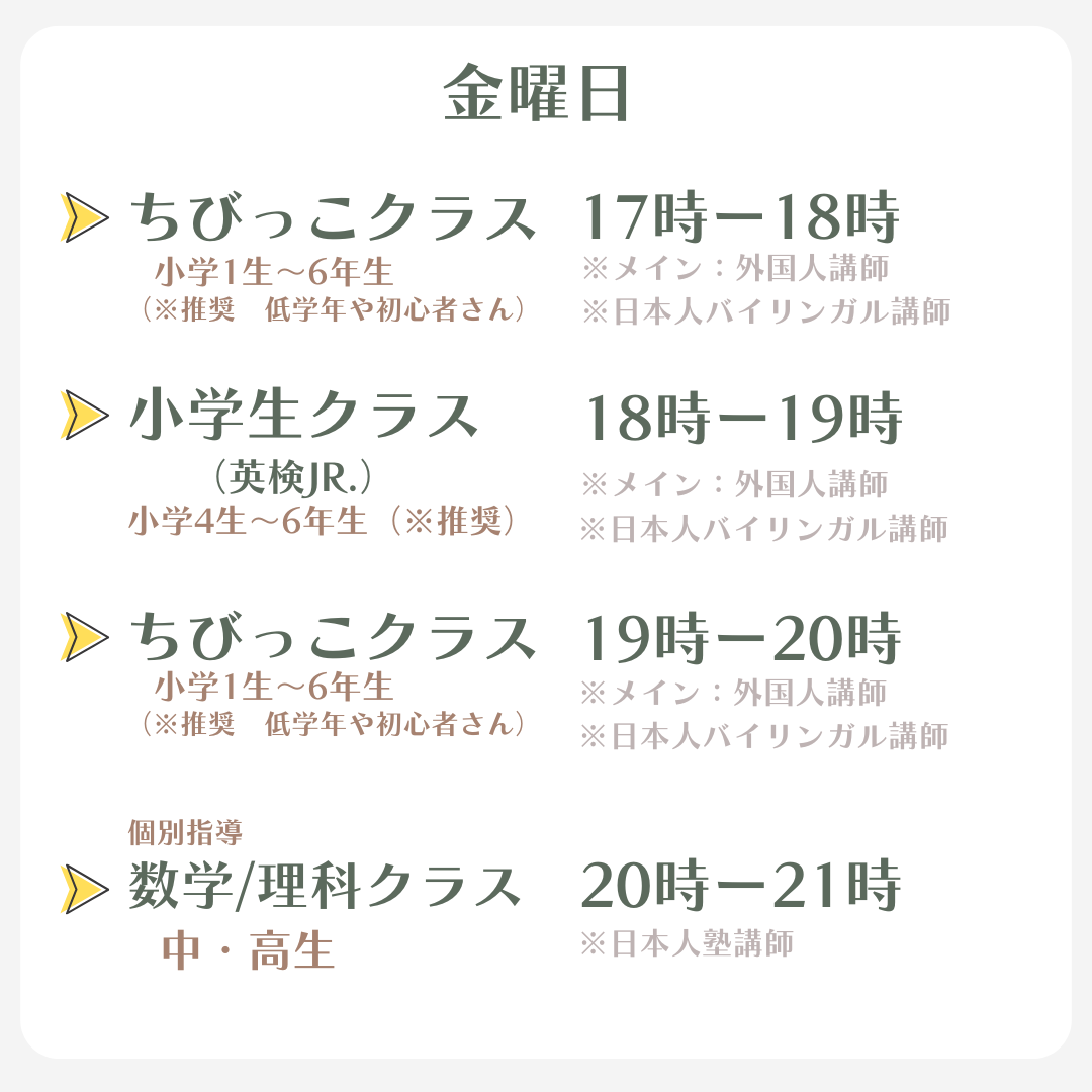日本語を覚えるように『音から文字』へ自然と習得していき、「英語って楽しい!」「英語が好き!」という気持ちを育てます。個別指導のクラス以外は、All Englishのレッスンです。日本人アシスタント講師もいますので、ご安心ください!