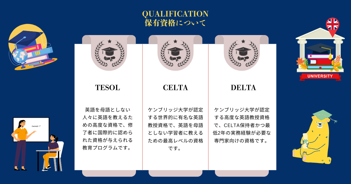 当教室では、TESOLやCELTAなどの資格、または同等の経験やスキルを持つ講師を採用し、正確で効果的な指導を提供しています。