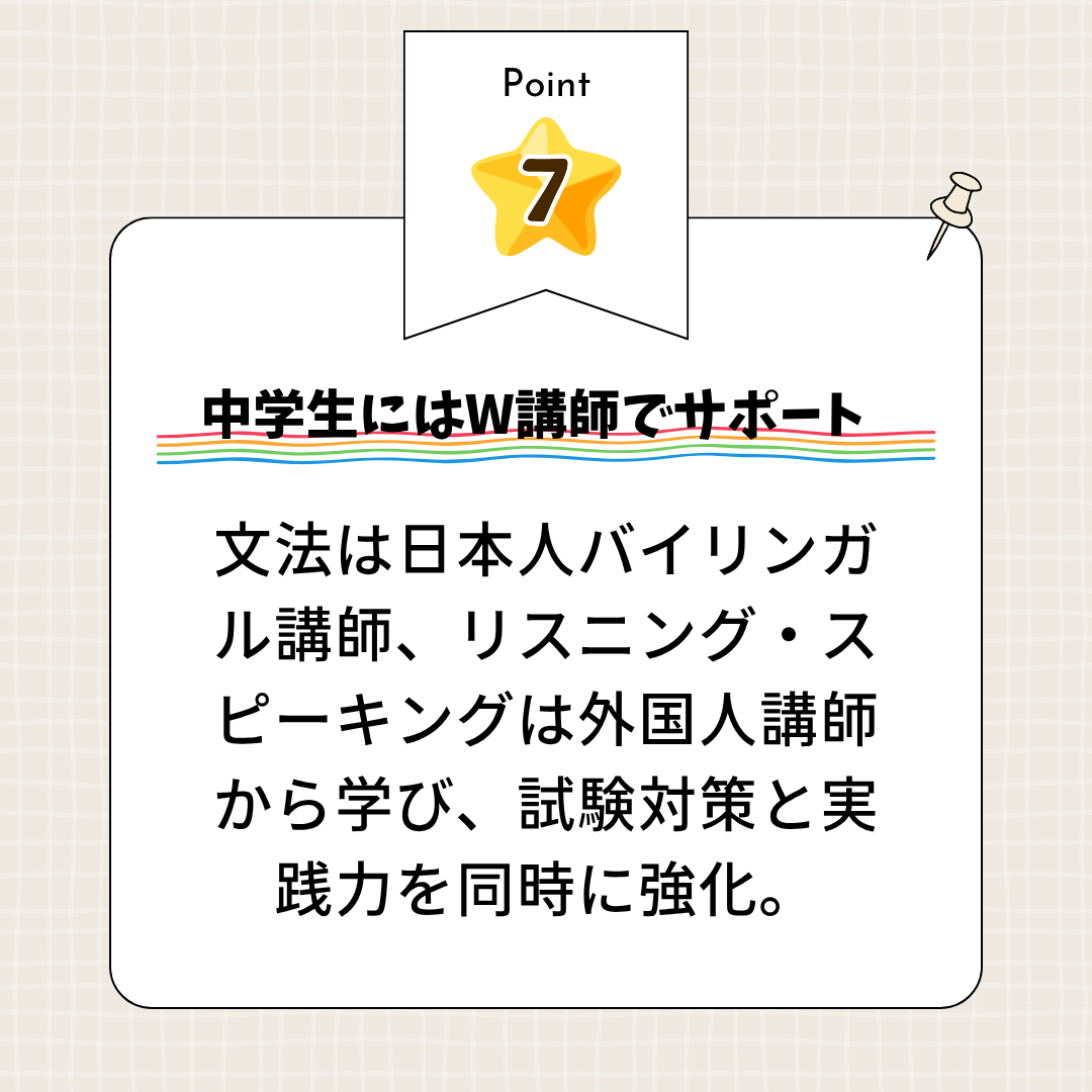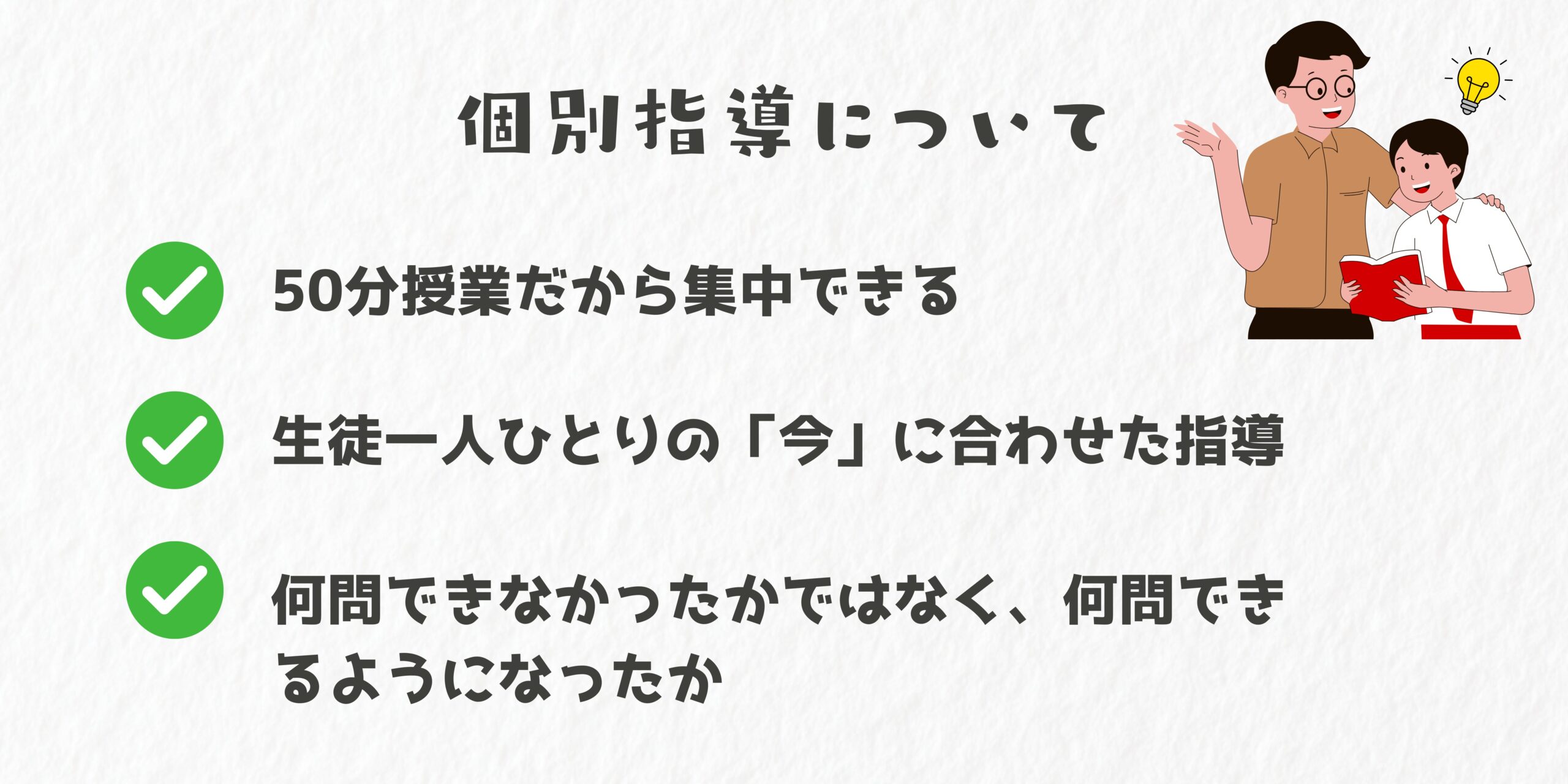 英検クラス、中学生の個別指導(セミマンツーマン)については、苦手克服・試験対策などを行います。