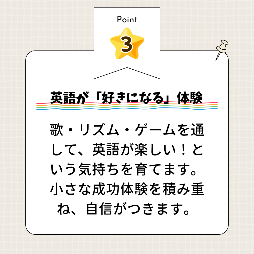 「聞く→話す→読む・書く」の順で、自然な英語習得を目指します。「英語って楽しい!」そんな気持ちを育てる土台を作ります。